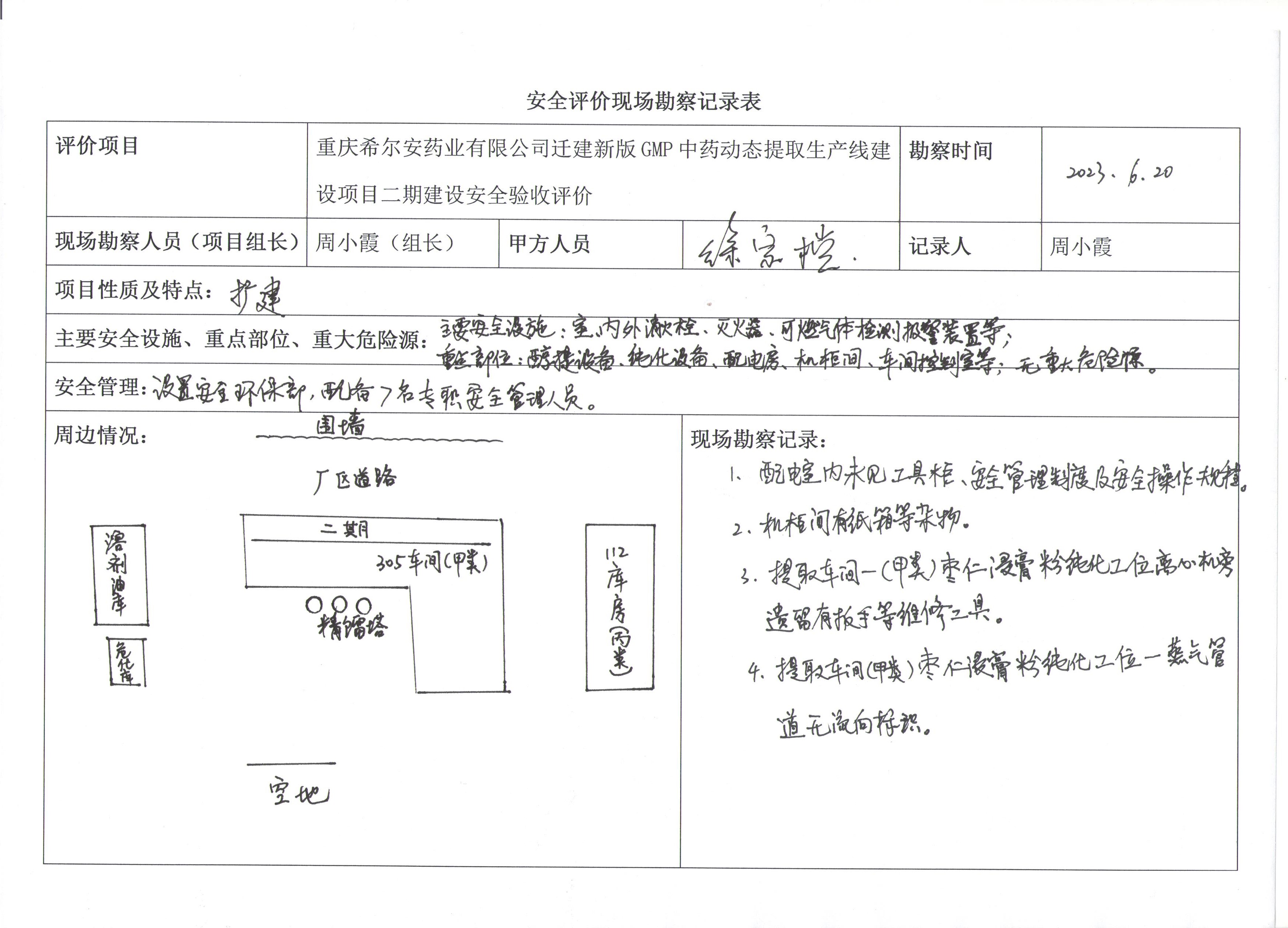 項目名稱 | 重慶希爾安藥業(yè)有限公司遷建新版 GMP 中藥動態(tài)提取生產(chǎn)線建設(shè)項目二期建設(shè)安全驗收評價 | 合同編號 | DA(渝)-PJ-20221009 | |||||