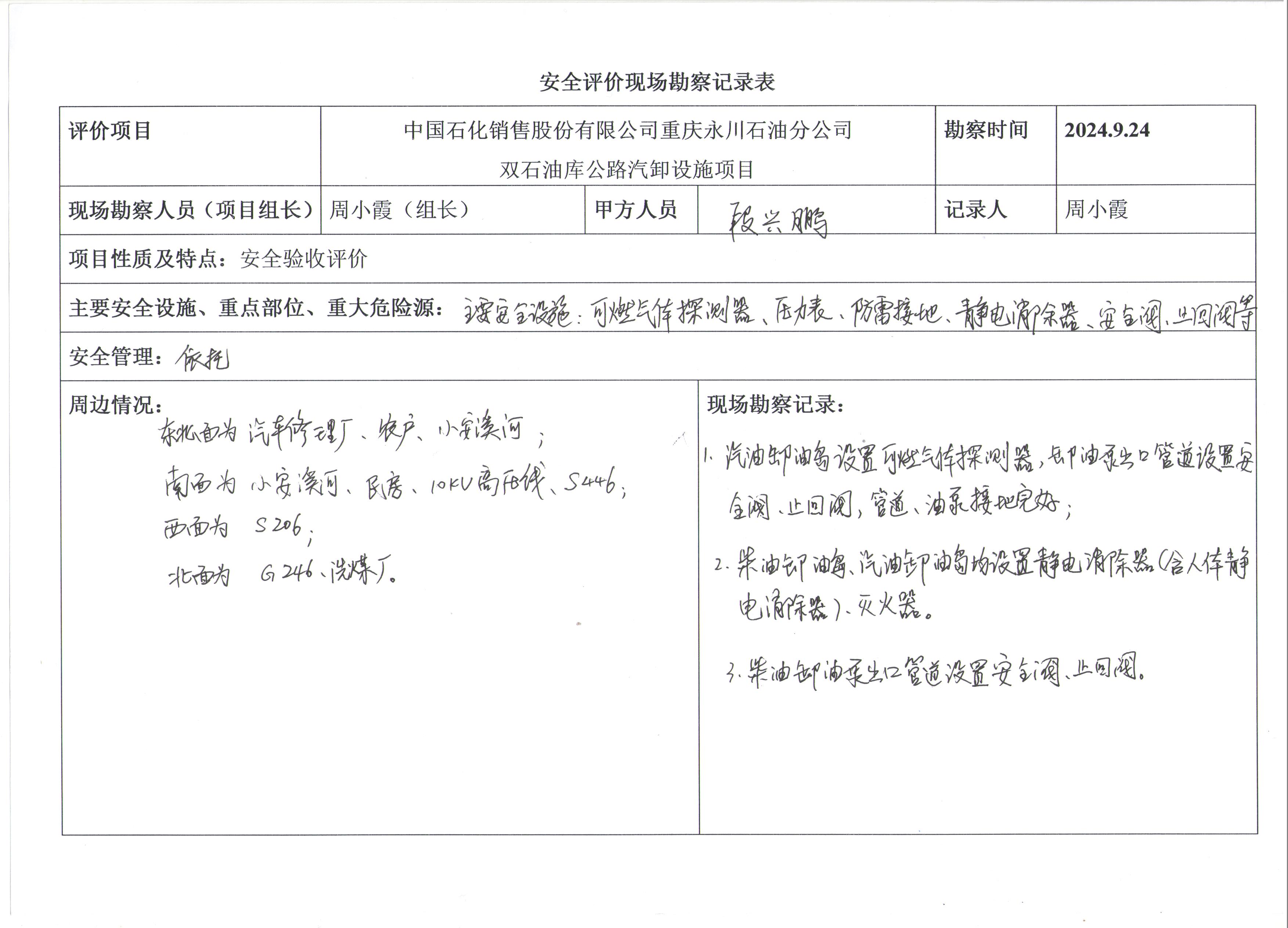 項(xiàng)目名稱 | 中國(guó)石化銷售股份有限公司重慶永川石油分公司雙石油庫(kù)公路汽卸設(shè)施項(xiàng)目安全驗(yàn)收評(píng)價(jià) | 合同編號(hào) | DA(渝)PJ033 | |||||
