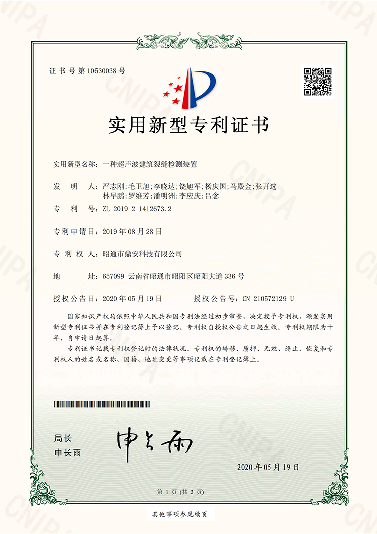 10530038一種超聲波建筑裂縫檢測(cè)裝置20200519實(shí)用新型專(zhuān)利證書(shū)